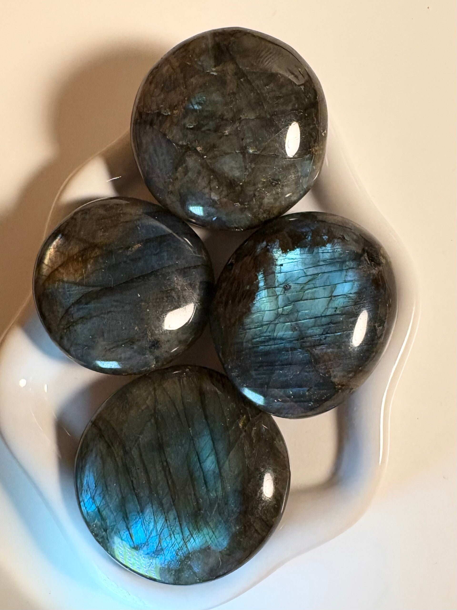 These Labradorite palm stones shimmer with flashes of blue, green, gold, and teal, each one unique in its play of light. Perfectly polished and smooth to hold, they fit beautifully in the palm — ideal for meditation, energy work, or simply carrying as a grounding companion.