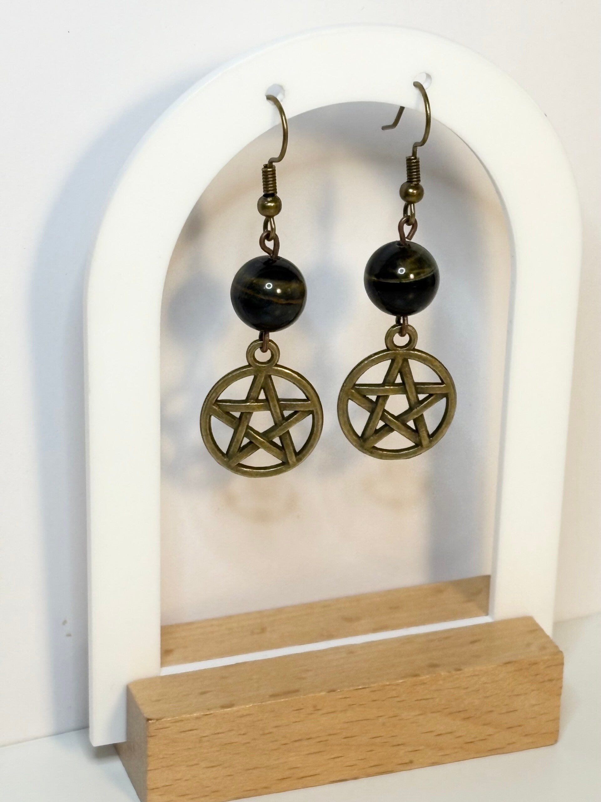 Channel grounding energy and inner strength with these handcrafted earrings, featuring genuine black tiger’s eye gemstones and antique bronze pentacle charms — a timeless symbol of protection and balance.