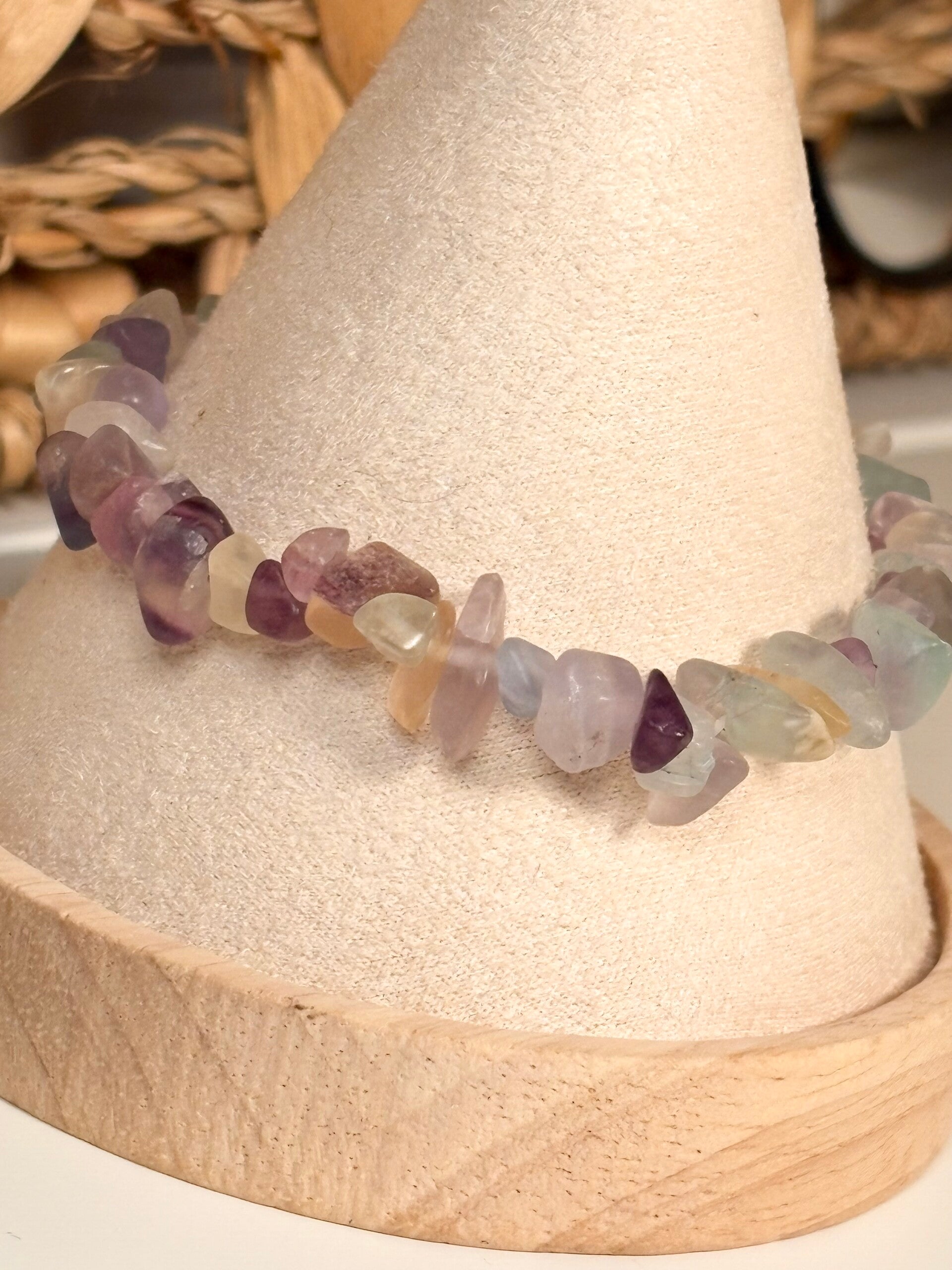 This stunning preloved Rainbow Fluorite bracelet features natural crystal chips in beautiful shades of purple, green, blue, and soft golden tones, creating a calming, nature-inspired look that’s perfect for everyday wear.