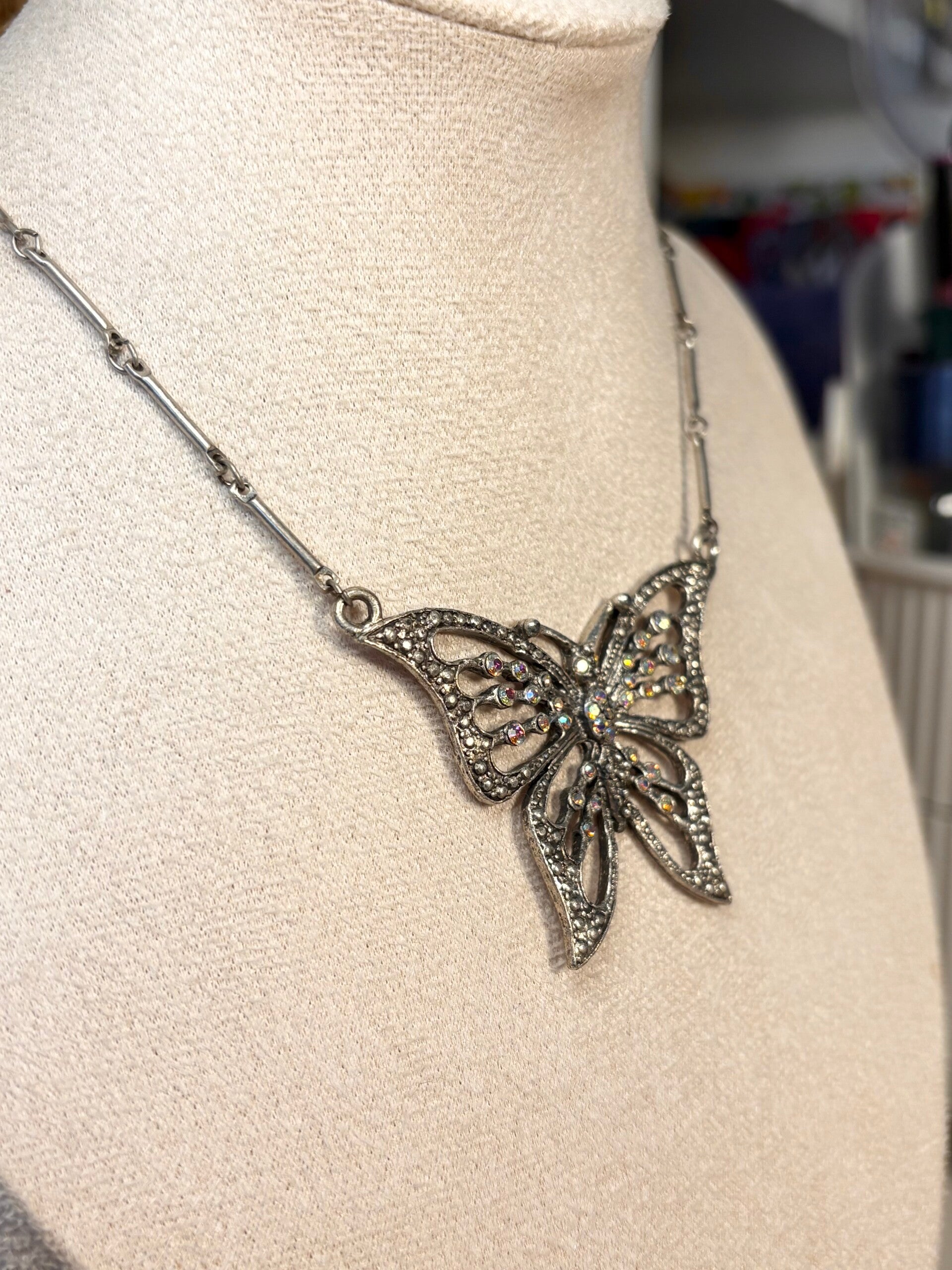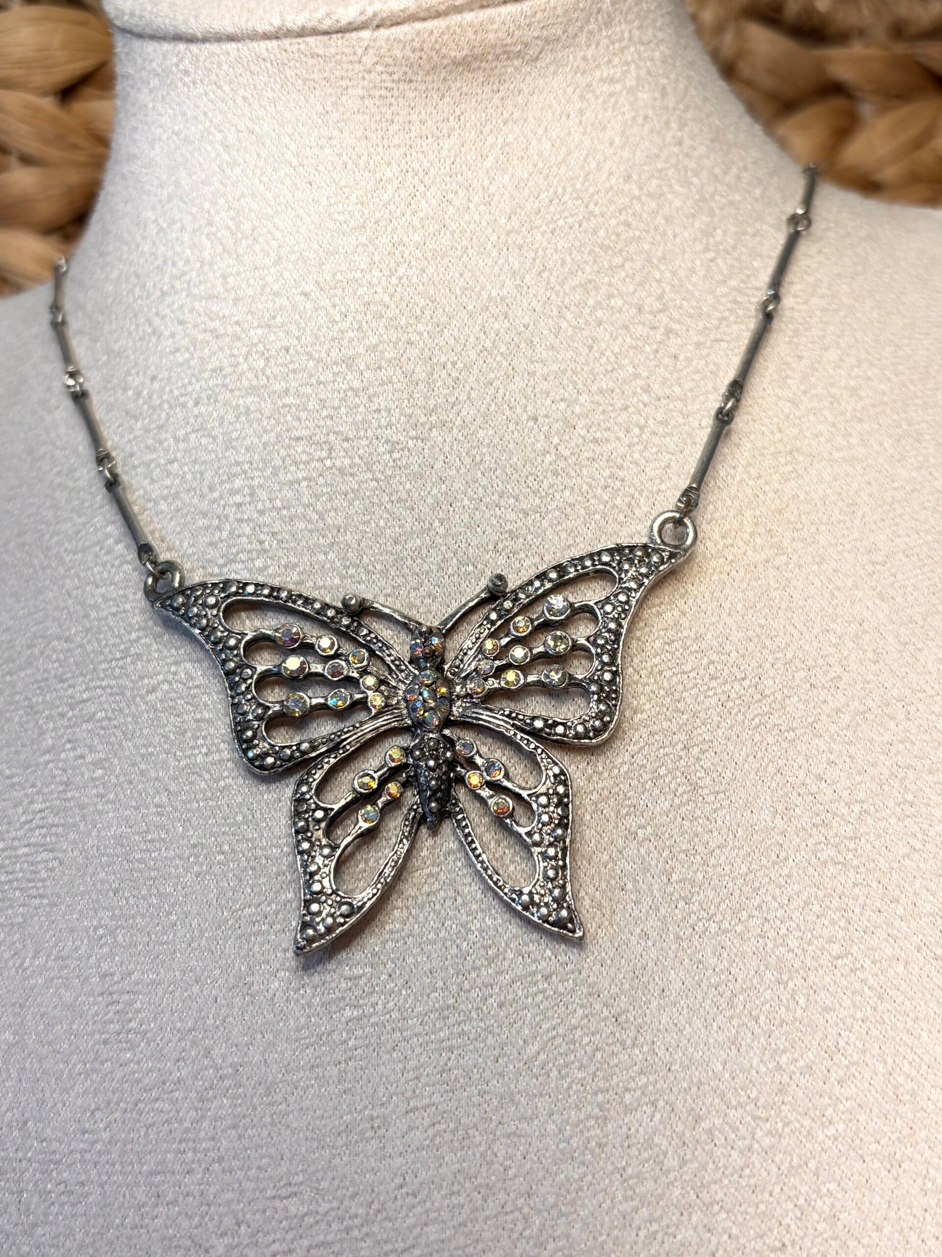 Make a statement with this stunning butterfly pendant necklace, featuring intricate filigree-style metalwork and shimmering iridescent stones that catch the light beautifully.