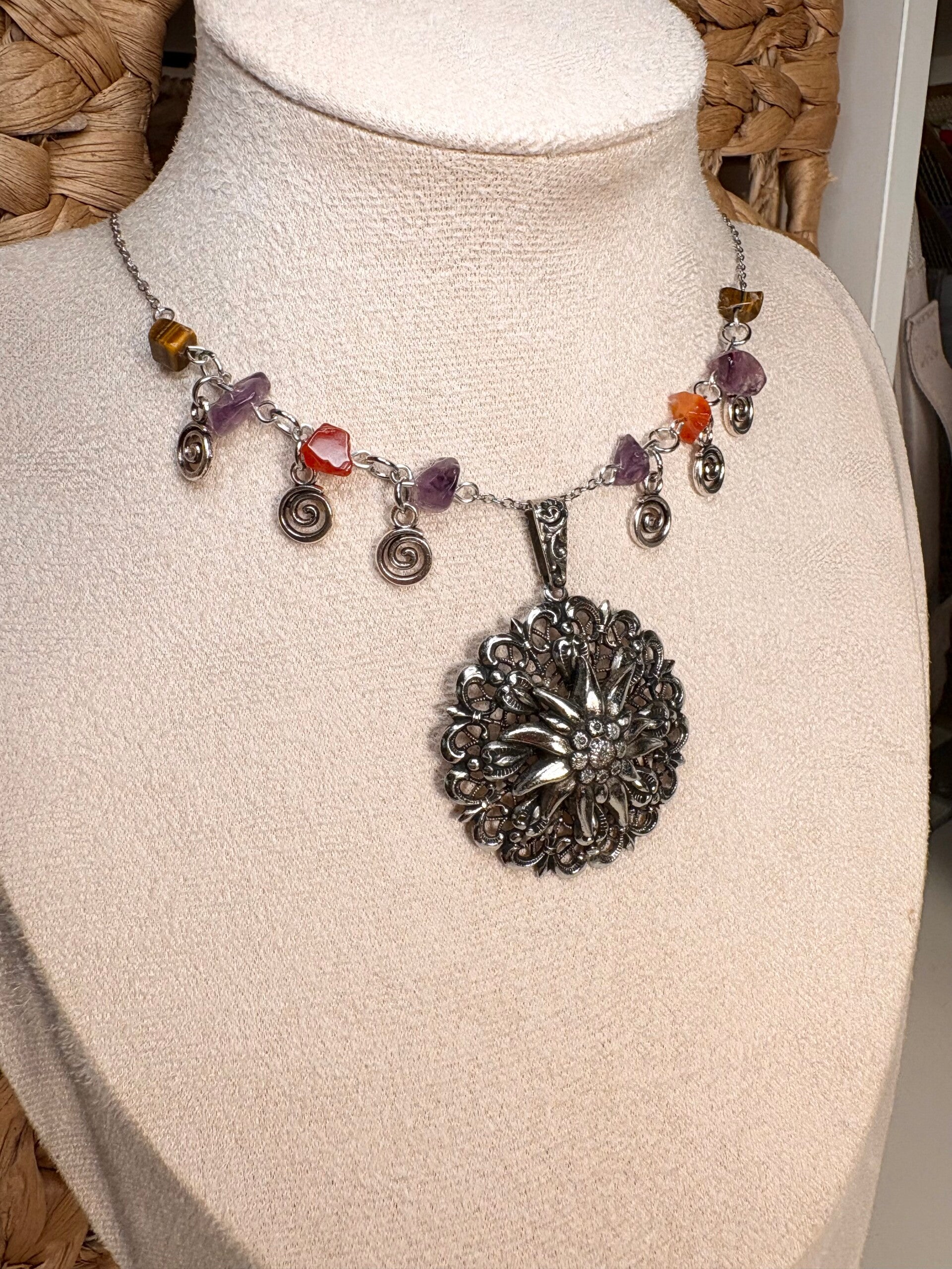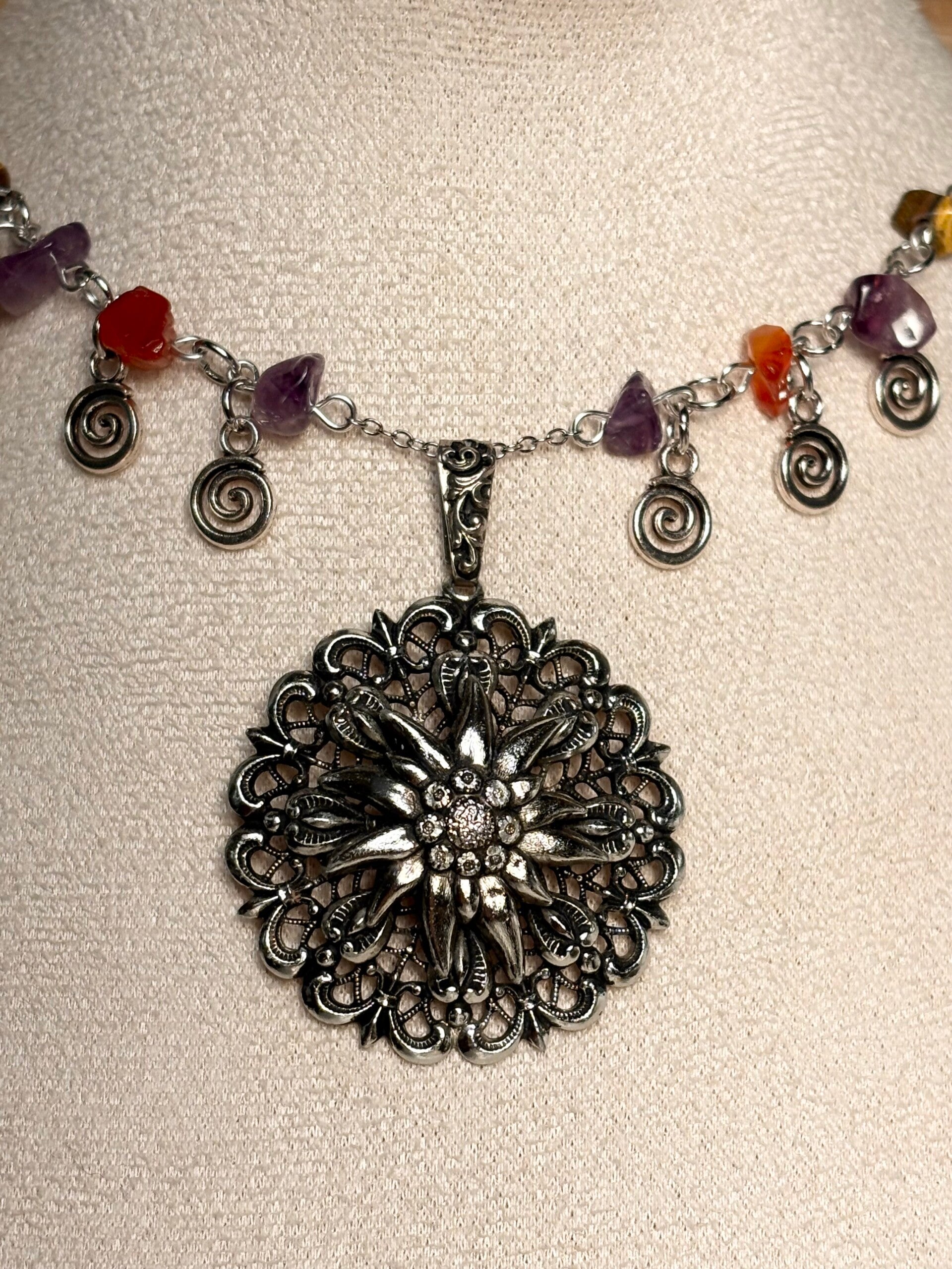 This unique, handcrafted necklace combines beauty, symbolism, and gentle spiritual energy. Featuring genuine gemstone chips and swirling charm accents, it’s finished with an intricate silver-tone mandala pendant — a symbol of harmony, protection, and inner balance.