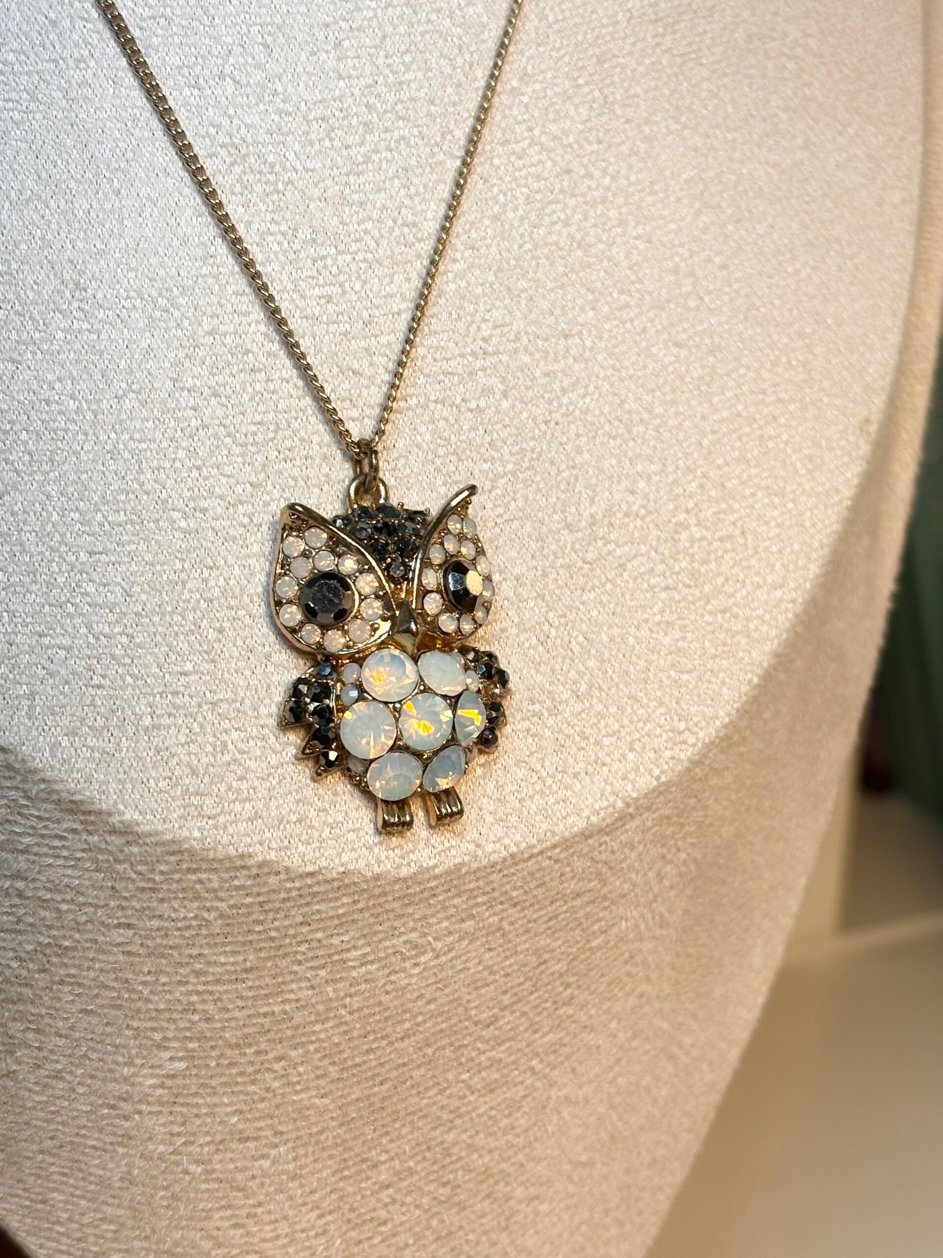 Add a touch of magic to your jewellery collection with this stunning preloved owl pendant necklace. Featuring beautifully faceted opal-style stones and sparkling crystals, this whimsical piece catches the light from every angle.