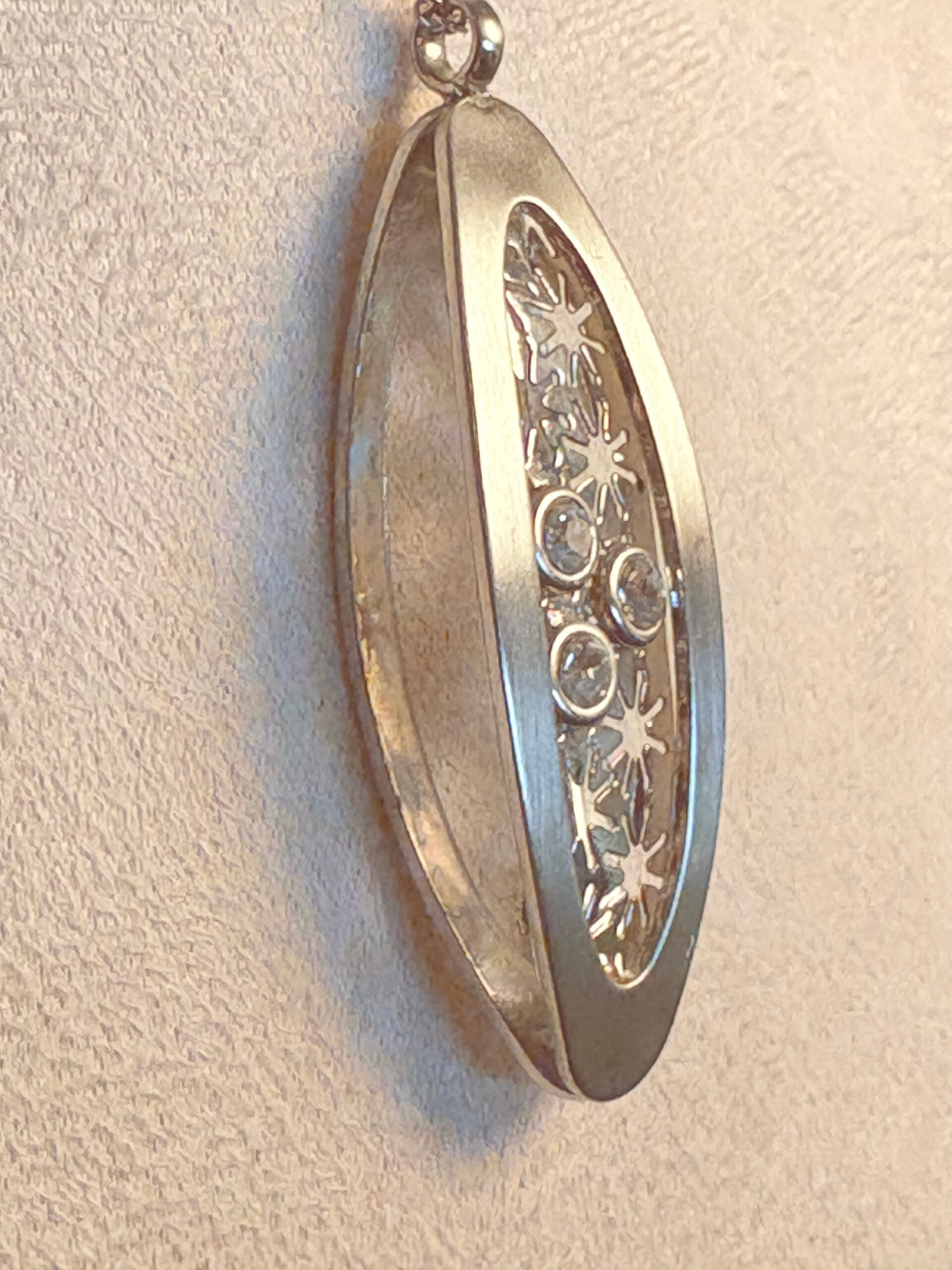 Add a touch of cosmic charm to your look with this beautifully detailed preloved pendant necklace. The long oval-shaped pendant features a brushed silver-tone frame with intricate cut-out starburst motifs and three bezel-set sparkling stones at its centre.