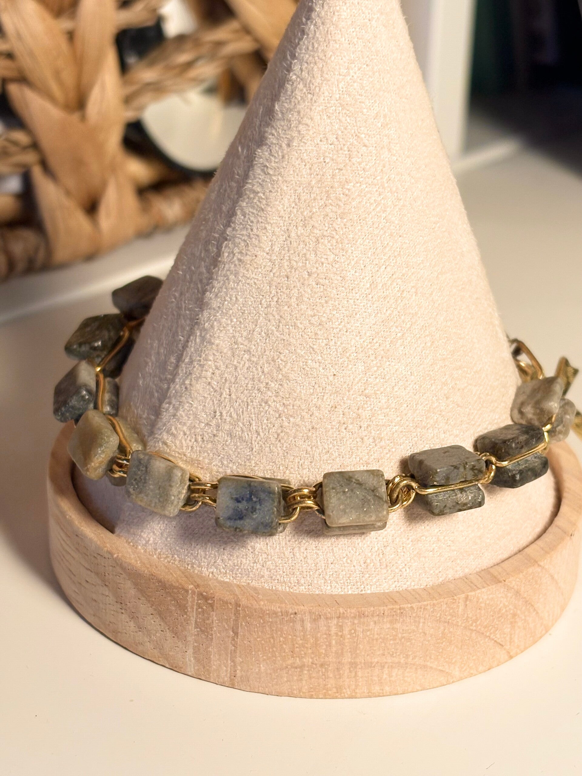 This beautifully unique rosary bracelet is handcrafted using what is believed to be genuine Connemara marble, a rare and ancient stone found only in the west of Ireland. Each square-cut bead displays its own natural variation of soft greens, greys, and earthy tones — no two are alike.