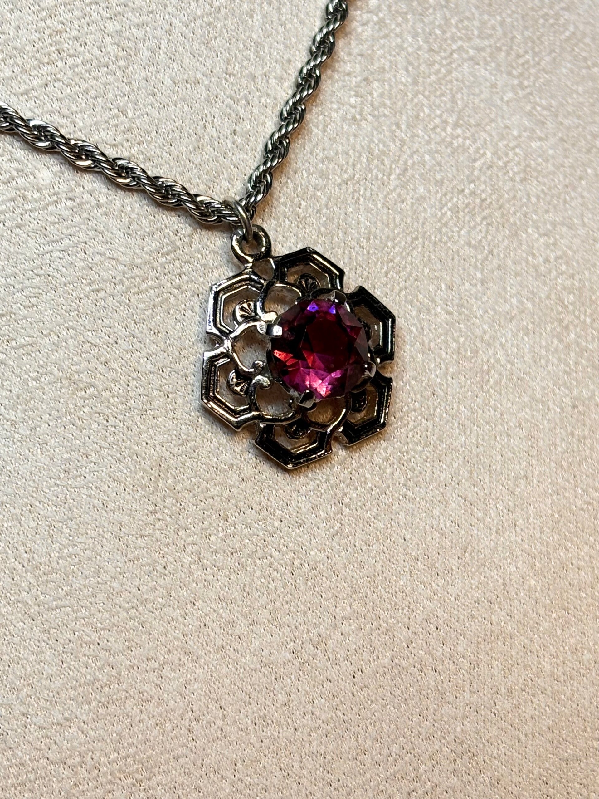 A striking, statement piece with gothic allure. This necklace features a deep pink faceted centre stone set in an ornate hexagonal silver-tone frame, hanging from a twisted rope-style chain. The rich hue of the stone catches the light beautifully, giving it a luxurious sparkle. Ideal for adding a touch of drama to any outfit – whether worn solo or layered with other pieces.
