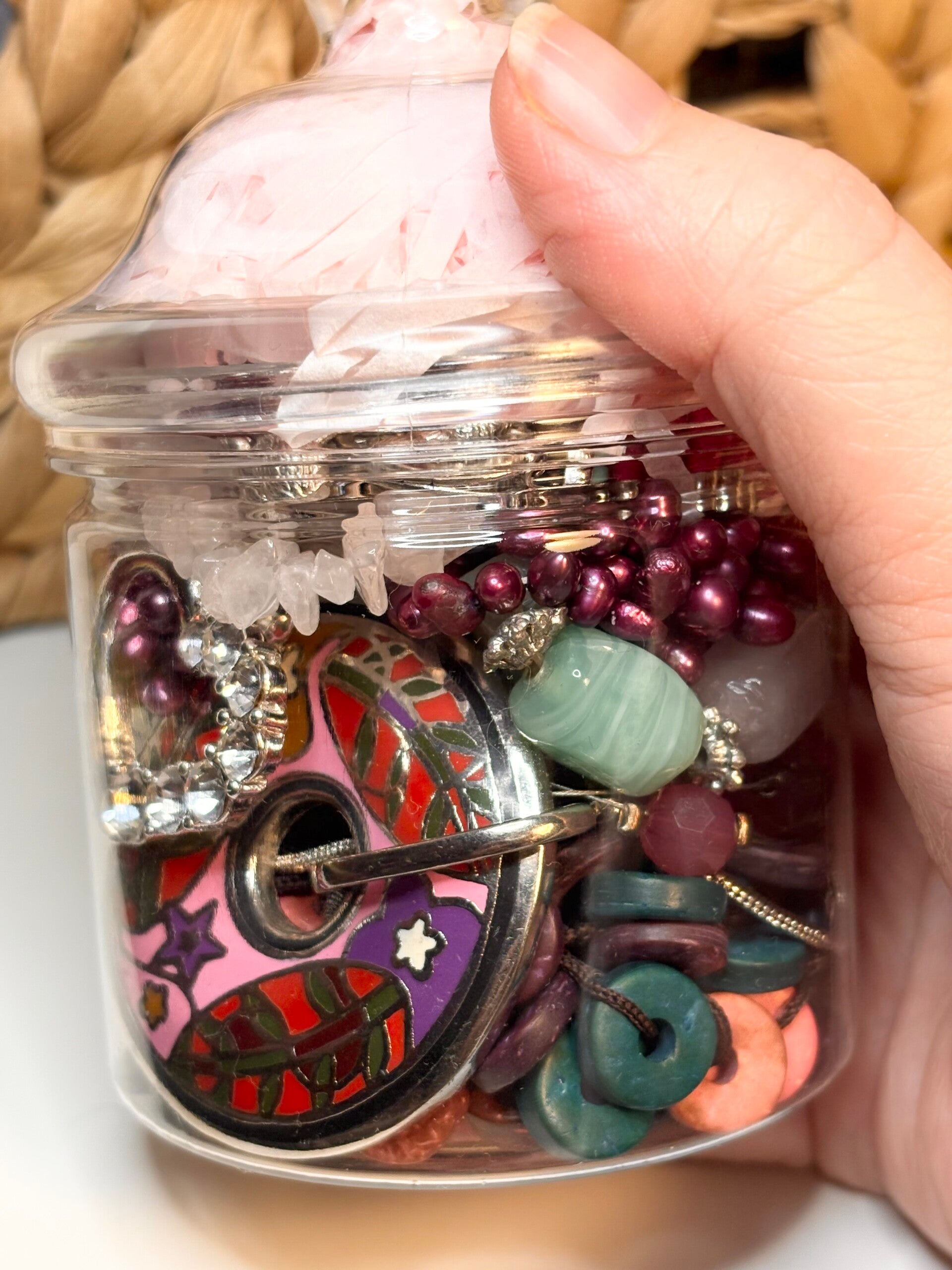 Unveil vibrant, eclectic jewellery in this joyful boho-style mystery jar. Bursting with rich purples, soft pinks, greens and natural tones, this collection includes a mix of statement pendants, beads, sparkly accents and nature-inspired charms. You may find genuine gemstones (like rose quartz) and shimmering metallic details.