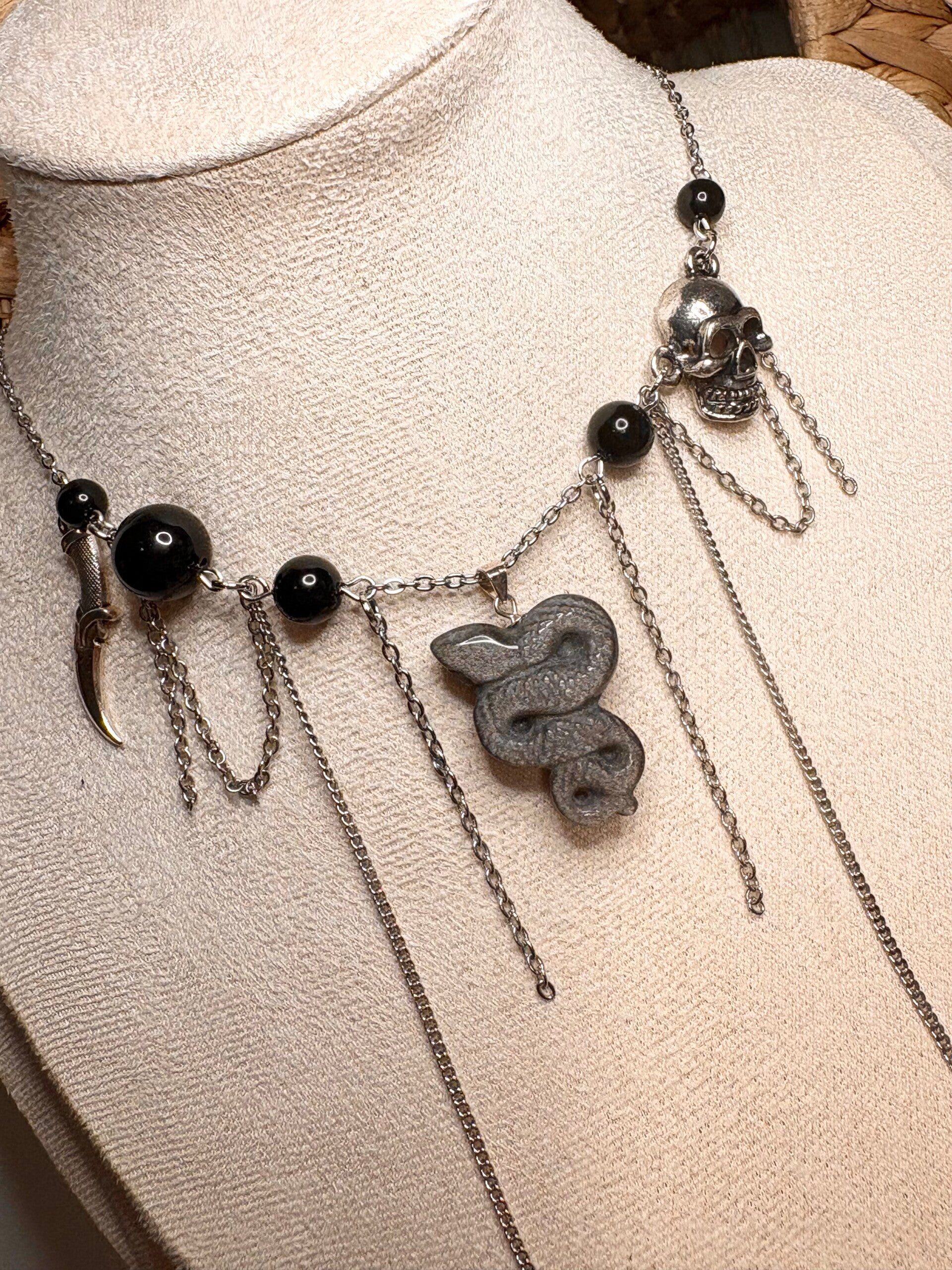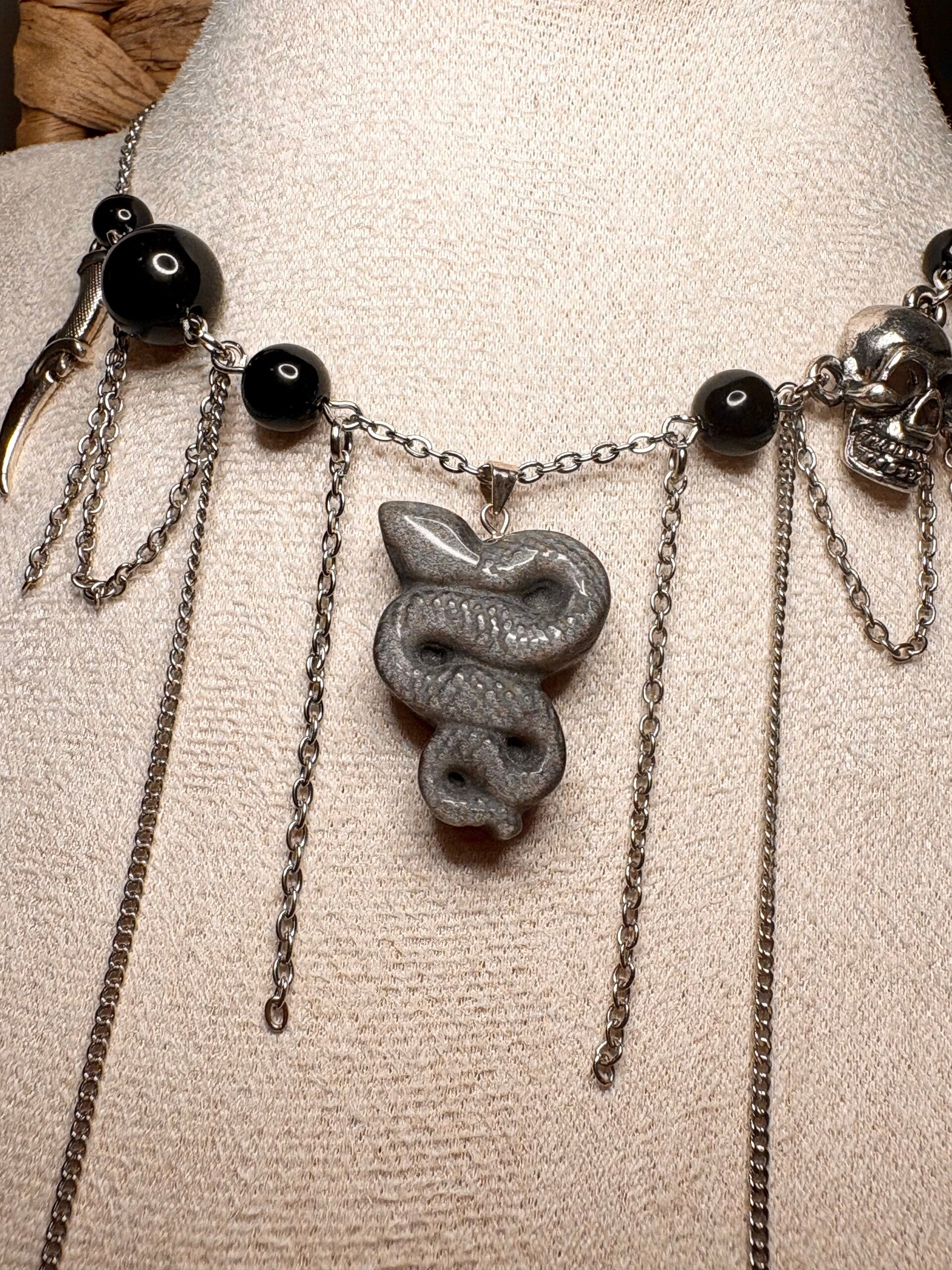 This bold, one-of-a-kind necklace is handmade with a genuine silver sheen obsidian snake pendant and glossy black onyx beads. Intricately detailed with skull and claw charms, layered chains and a gothic aesthetic, this piece is perfect for anyone who loves unique, edgy jewellery with powerful symbolism.