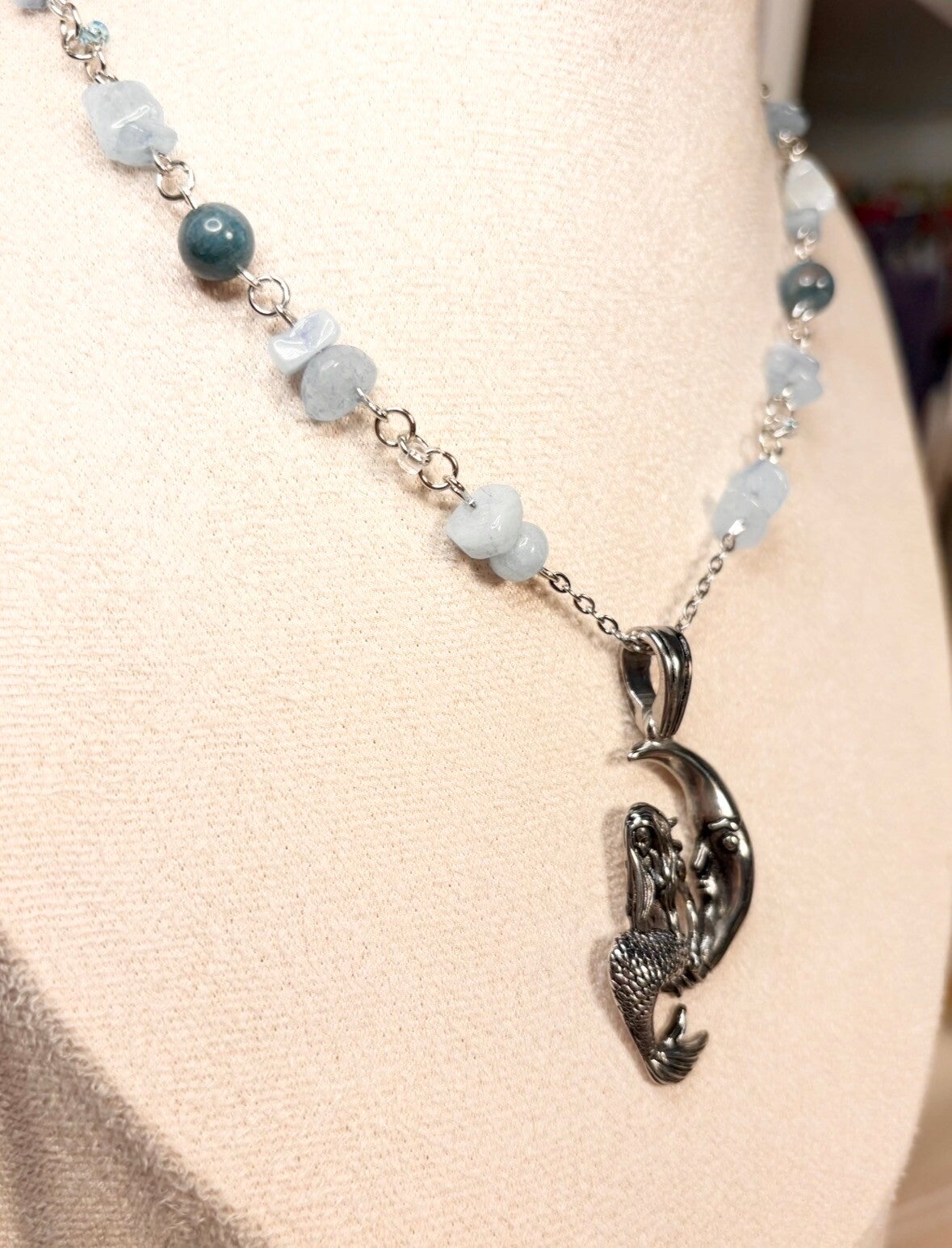 This dreamy ocean-inspired necklace features a beautifully detailed mermaid embracing the moon, suspended from a strand of aquamarine chip beads and genuine apatite rounds.