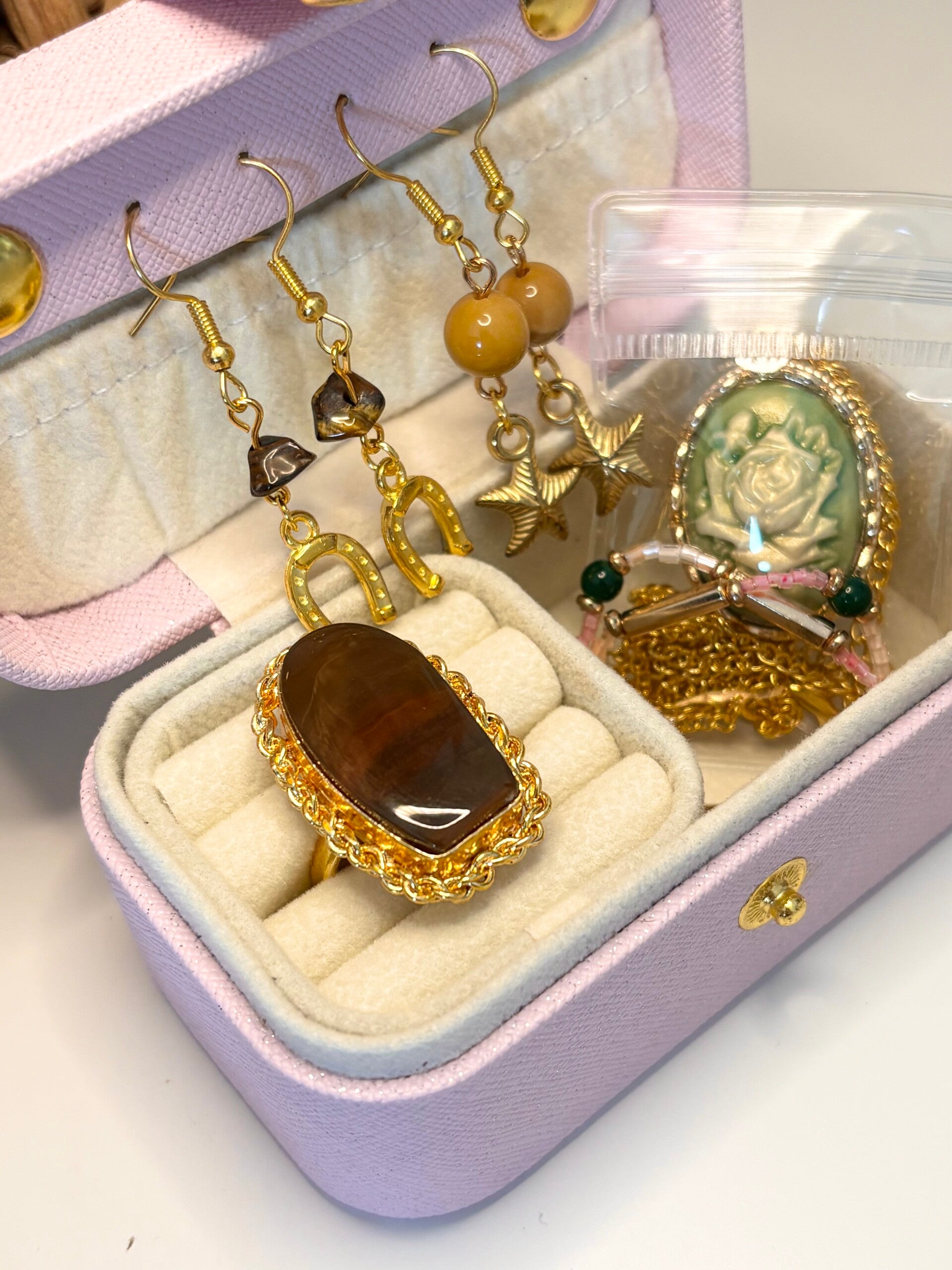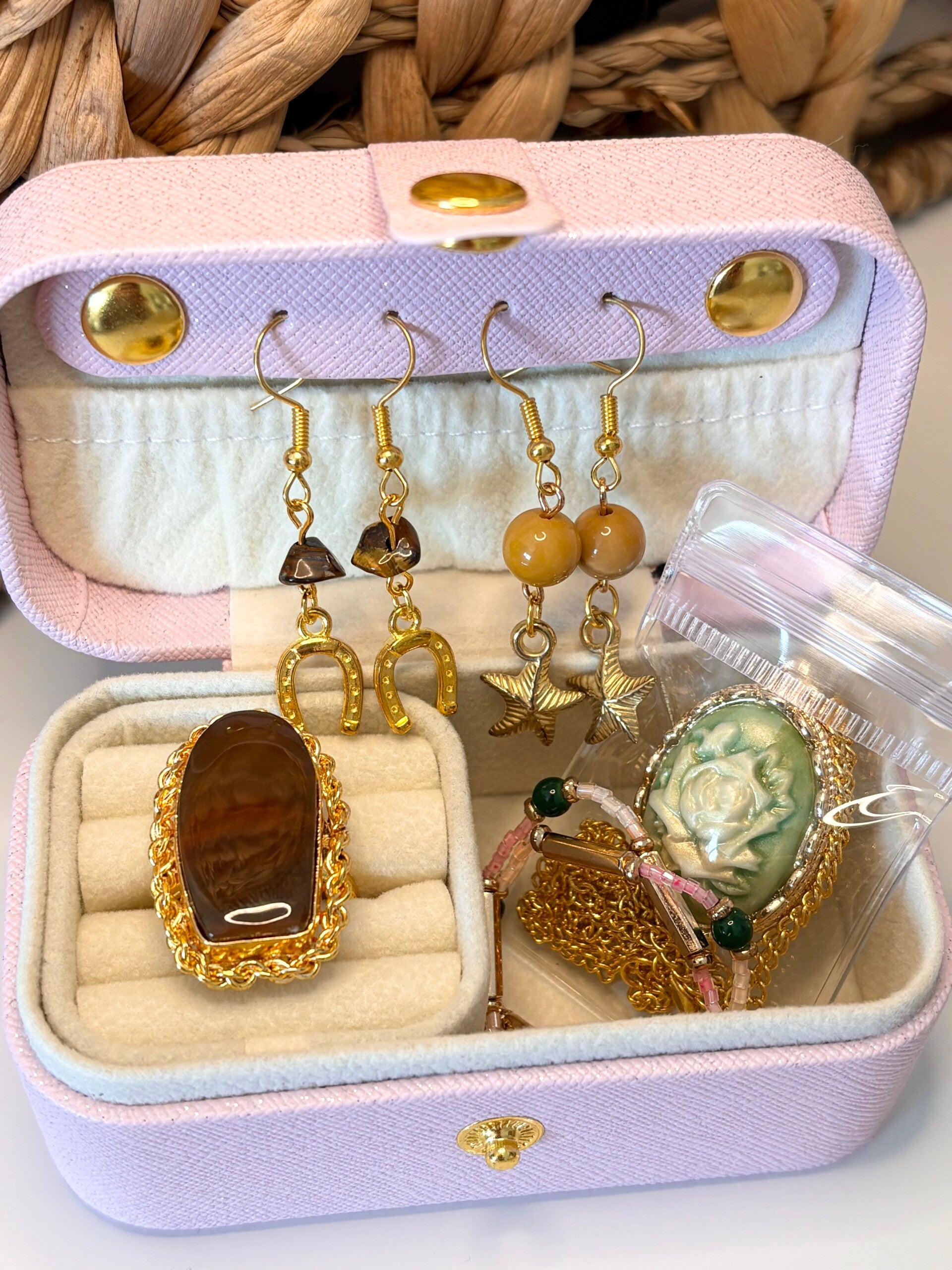 You get what you see, this mini travelling jewellery box with the contents included. Inside includes: