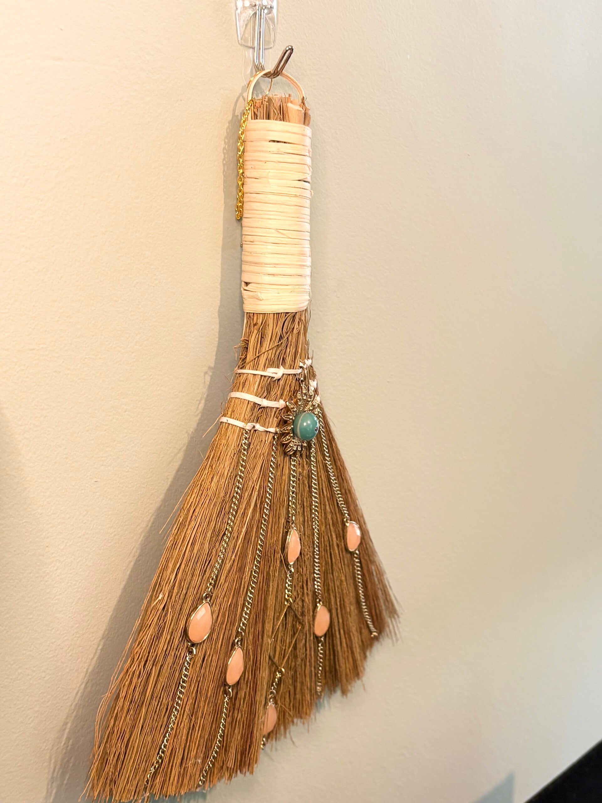 Natural broom fibres are wrapped and woven with cascading gold chains and peach-toned stones, centred with a radiant turquoise sunburst charm — symbolising vitality, clarity and light.
