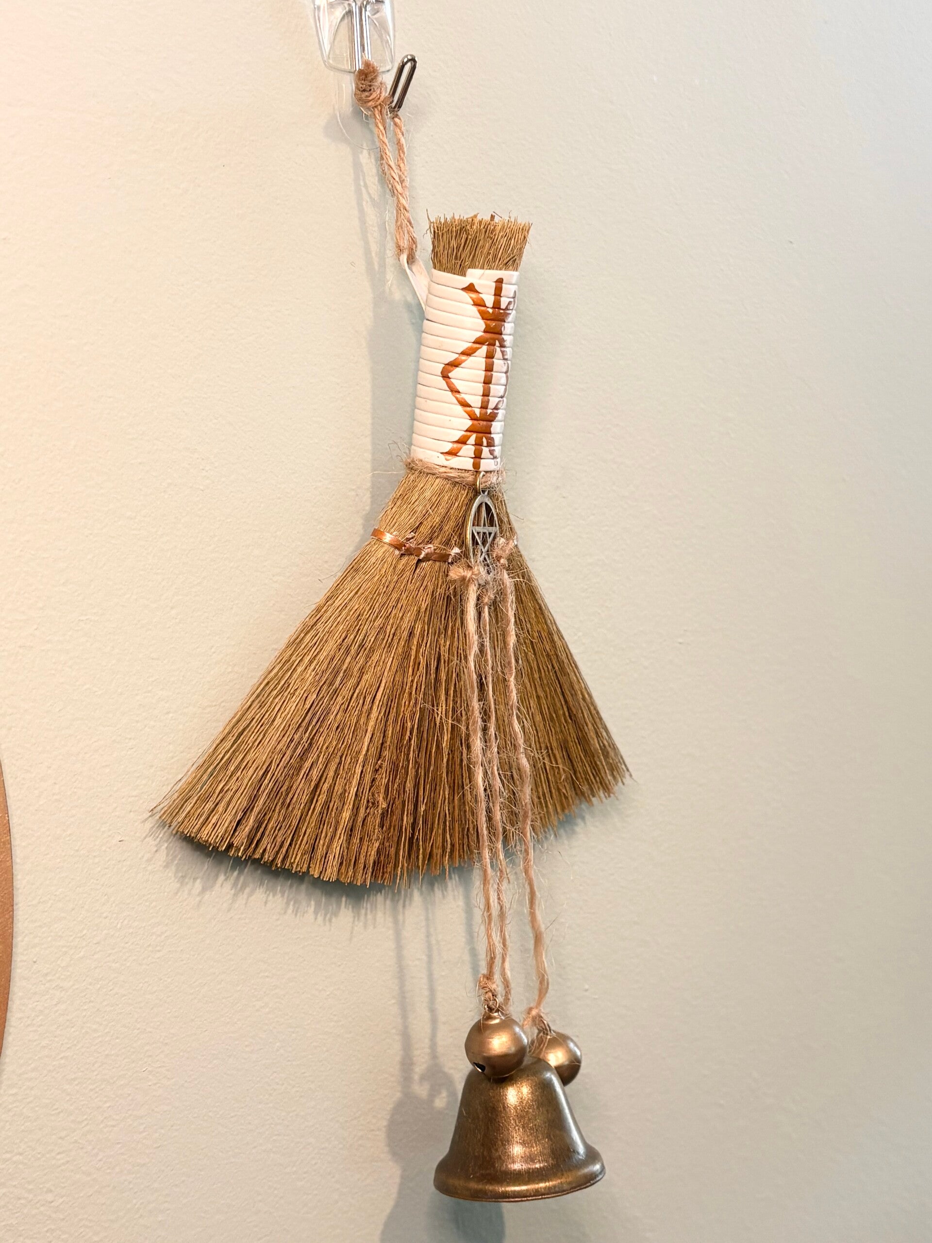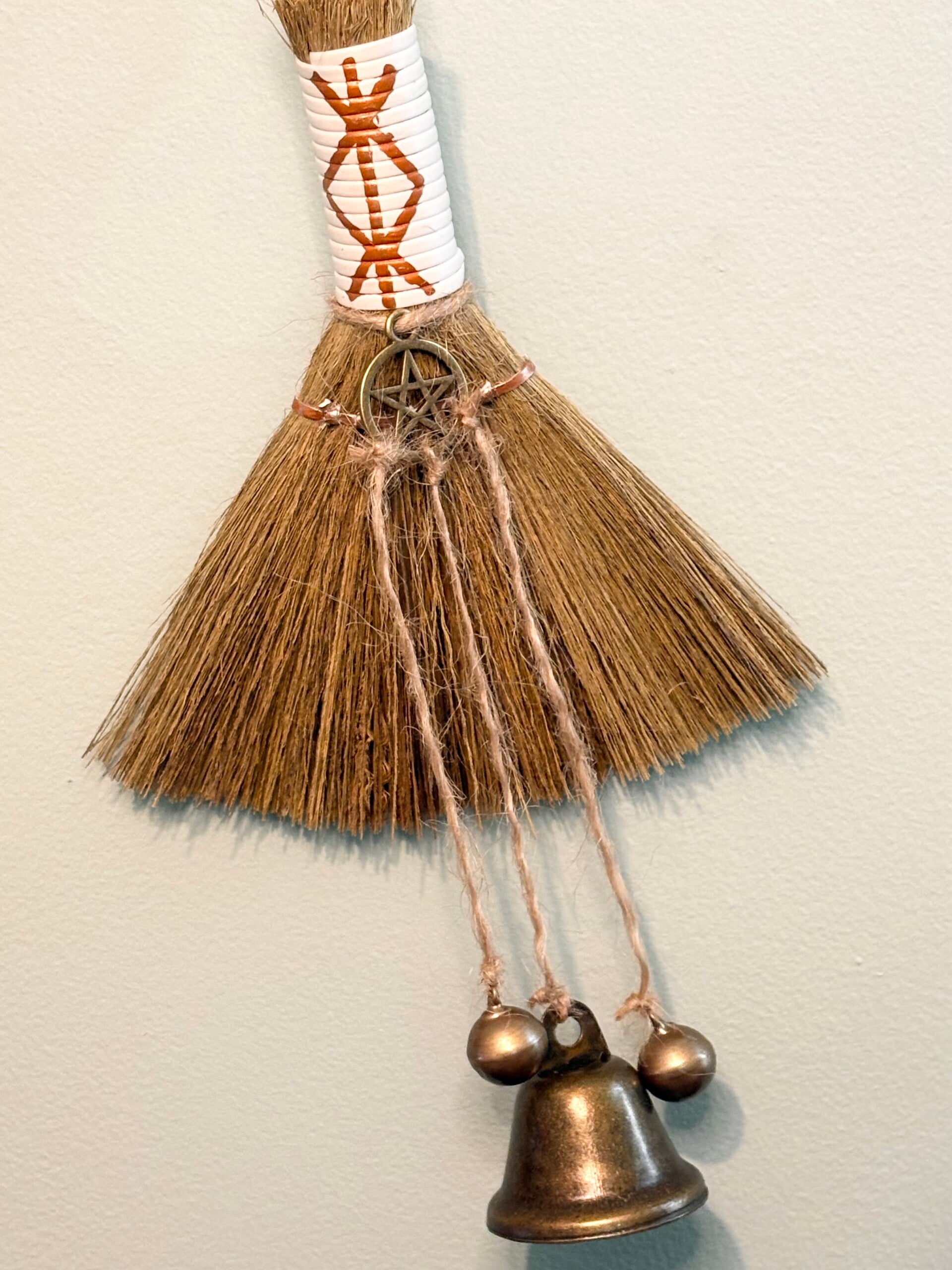 Wrapped in natural fibres and finished with a hand-painted sigil-style marking, this piece features a pentacle charm — representing balance and protection — and hanging brass bells to symbolise the clearing of stagnant energy through sound.