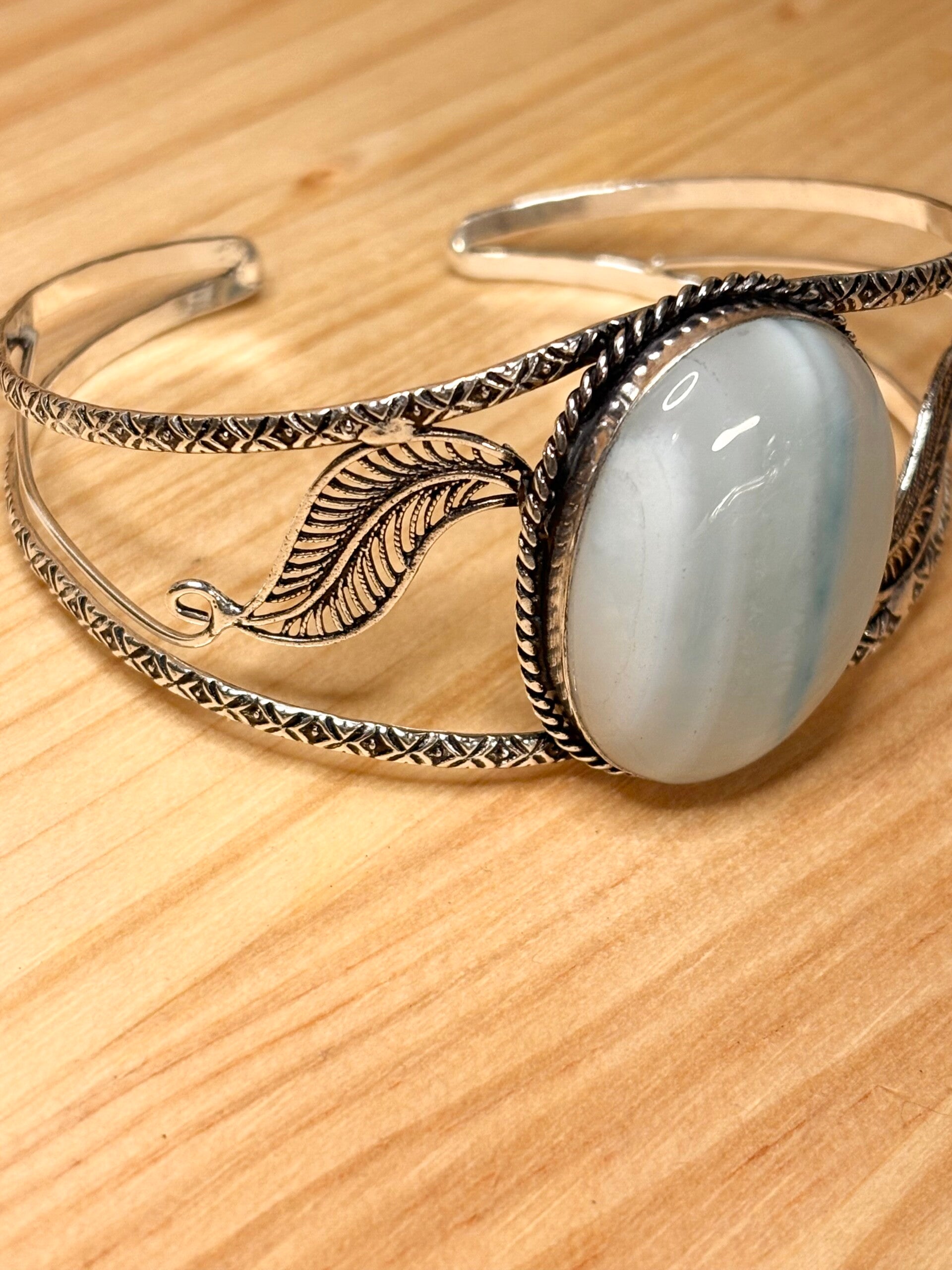 A beautiful open cuff bracelet featuring a large oval genuine banded agate cabochon, set within an ornate silver-tone band with delicate leaf detailing on each side 🌿
