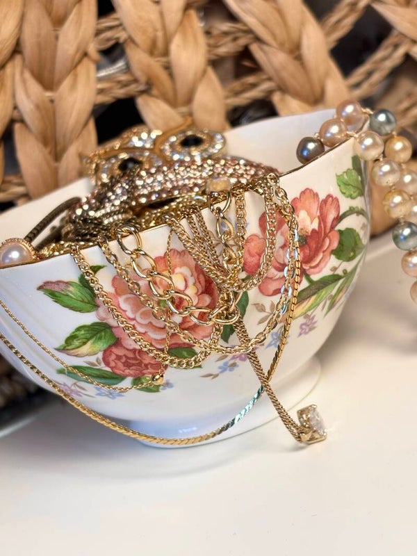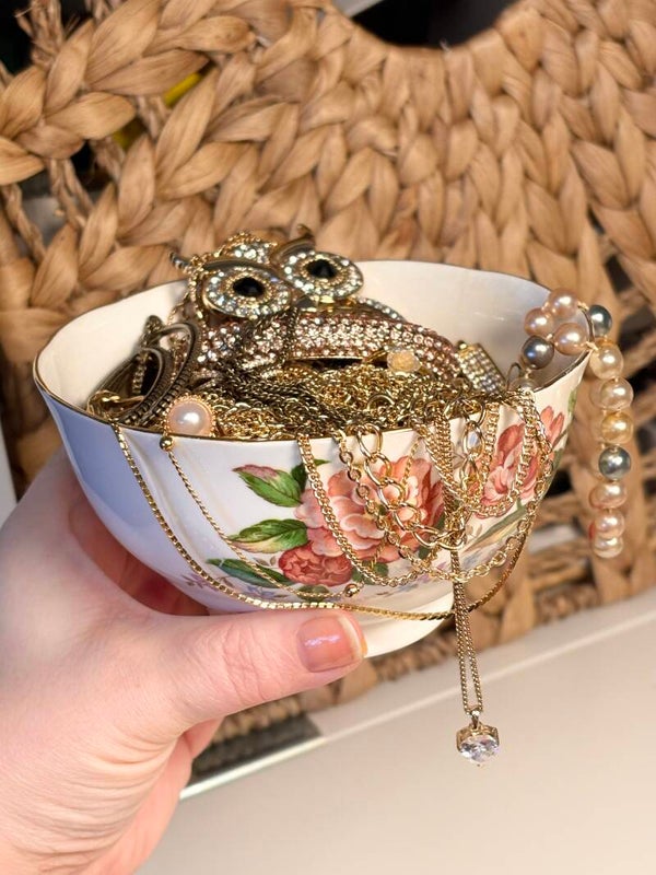 This gorgeous floral teacup-style bowl is overflowing with golden tones, statement pieces and layered chains – the kind of find that feels like you’ve just uncovered a hidden jewellery stash 🕊️