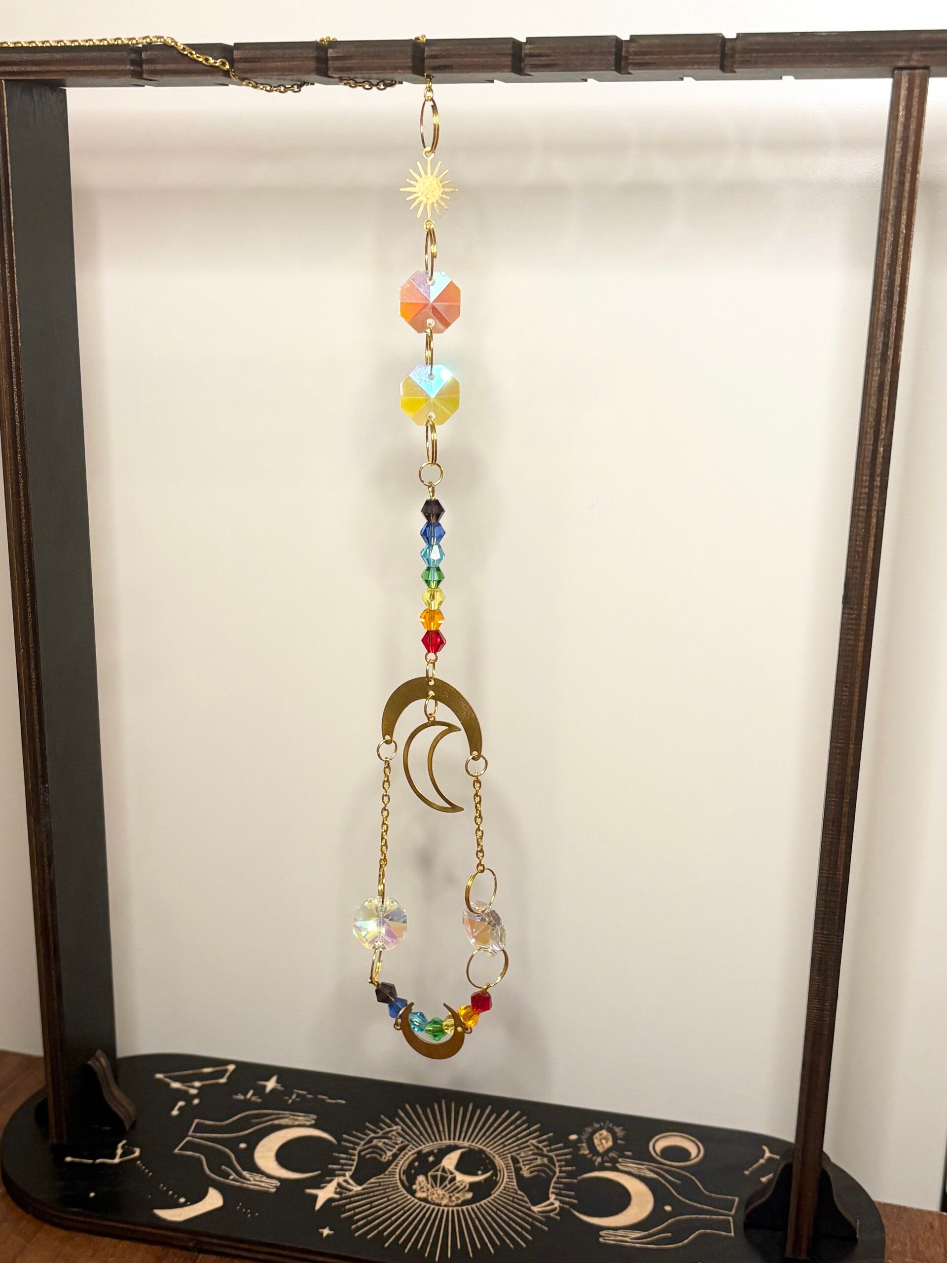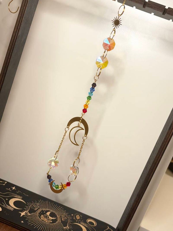 Featuring shimmering crystal beads, soft rainbow tones and delicate gold celestial details, this piece is designed to catch the light and scatter tiny prisms around your room 🌈