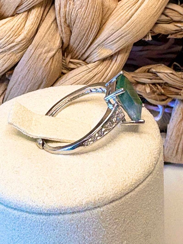 This stunning ring features a rectangular moss agate centre, and as you can see in the close-up images, the natural inclusions create a beautiful, almost tree-like scene within the stone — completely unique and impossible to replicate.